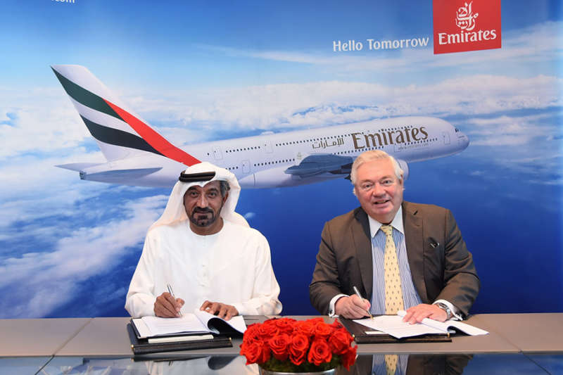 SAR Sheikh Ahmed bin Saeed Al Maktoum, presidente y director Ejecutivo de Emirates Group, y John Leahy, COO Customers de Airbus Commercial Aircraft, firmaron un acuerdo sustancial para adquirir 20 aviones A380, con la opción de contar con otros 16 adicionales que se entregarán a partir de 2020, cuyo valor asciende, según la lista actual de precios, a $16 mil millones de dólares.