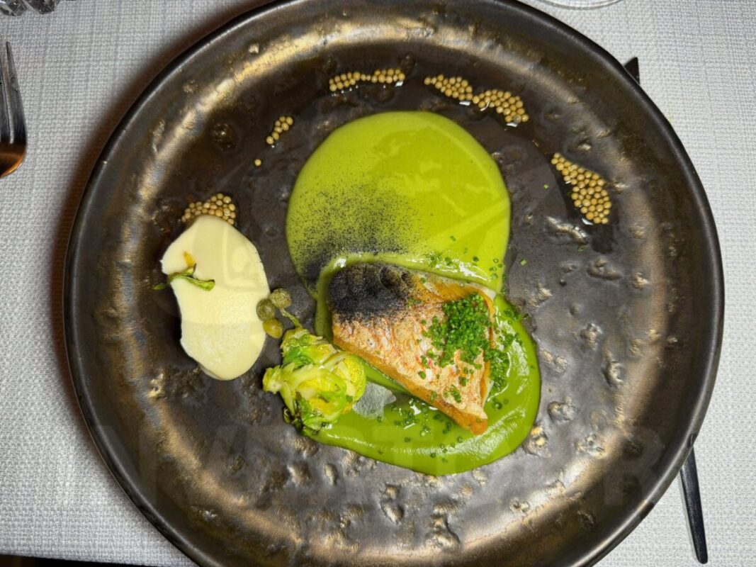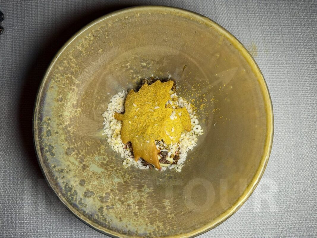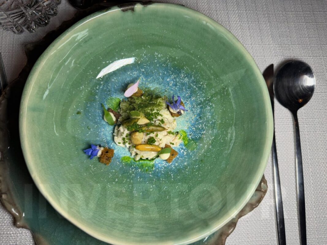 Los platillos incluyeron: Ensaladilla de cangrejo con mantequilla y cebollin; Camarón azul templado, esferas de pepino, yuzu, algas, brotes y shiso.