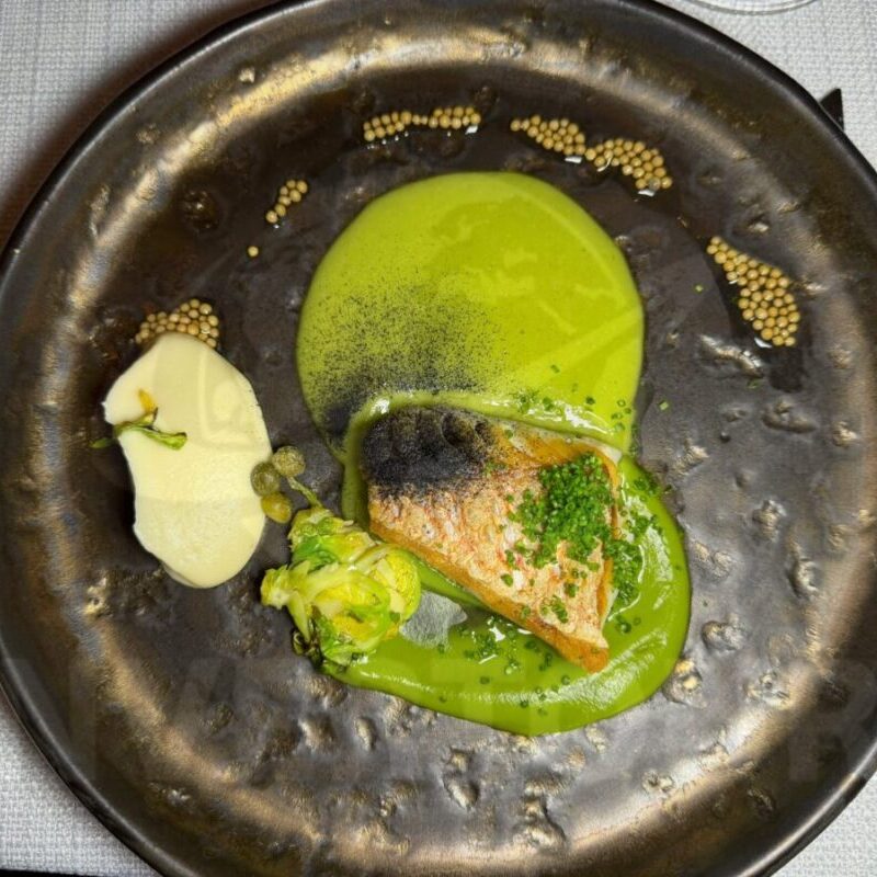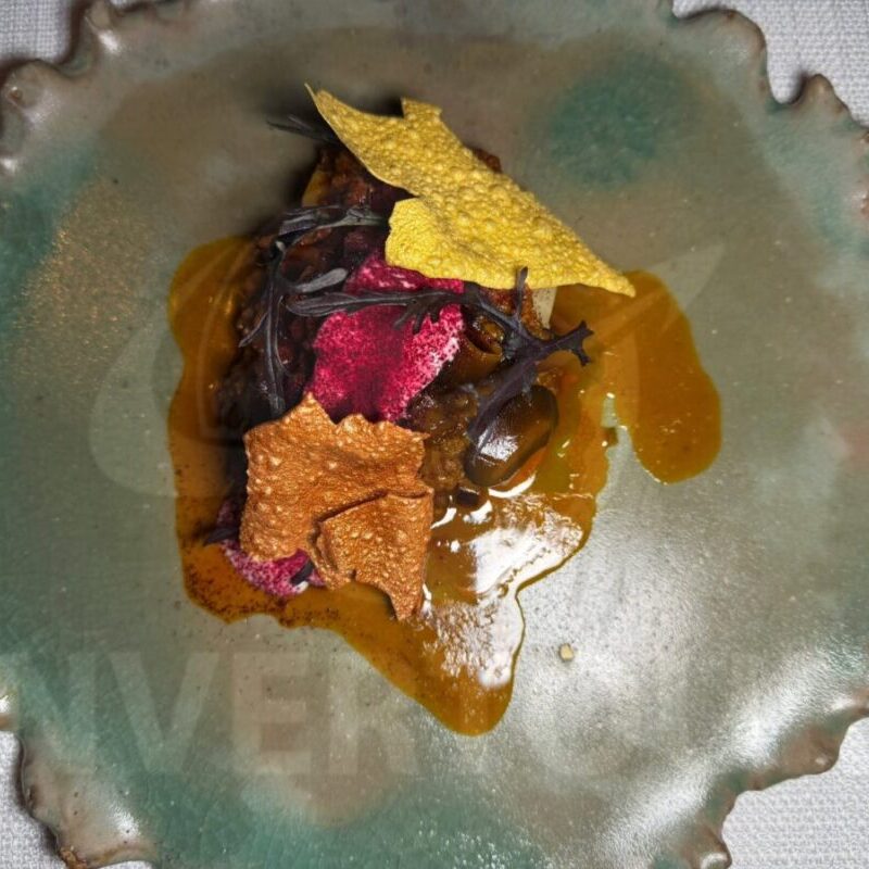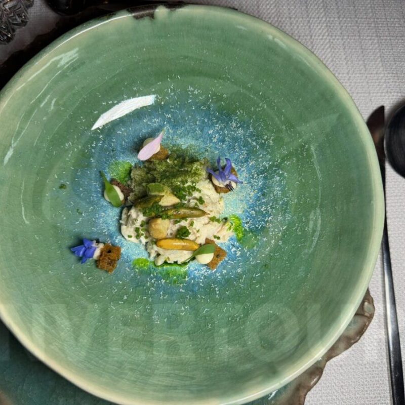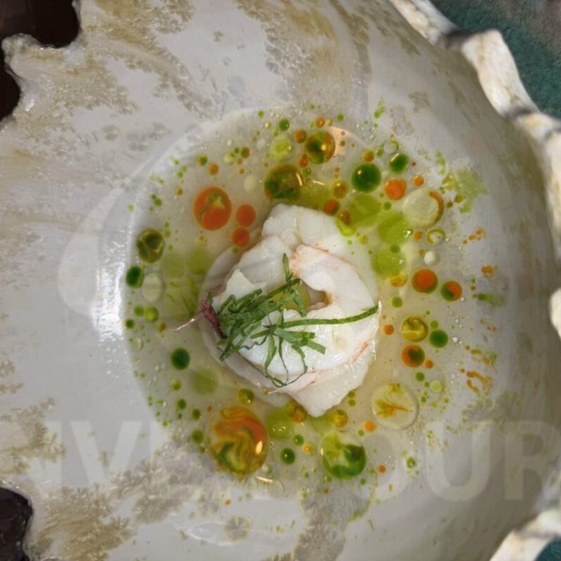 Los platillos incluyeron: Ensaladilla de cangrejo con mantequilla y cebollin; Camarón azul templado, esferas de pepino, yuzu, algas, brotes y shiso.