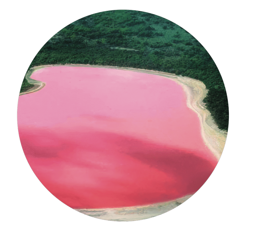 Rodeado de un bosque de eucaliptos, ubicado en Australia occidental. Adquiere esa tonalidad rosado chicle por la microalga Dunaliella salina, que produce betacaroteno para protegerse de los rayos UV, en conjunto con bacterias halófilas.